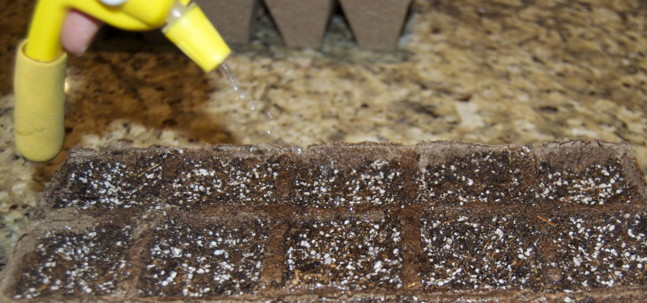 To start, moisten the starting mix a little by spraying it (while in the bag) with water. This gives the mix a little moisture throughout but keeps it dry enough for easy handling. Don’t get it soggy. Next fill your containers with the starting mix. I use a small tea-cup (borrowed from my daughters) because it is a perfect size for filling the Jiffy strips. Now I again take the spray bottle and spray the filled planters so the soil medium is moist throughout. (About like a sponge that has been wrung out) This also slightly compacts the starting mix so you can see if you need to add a bit more before planting. I recommend filling slightly under the top of container.