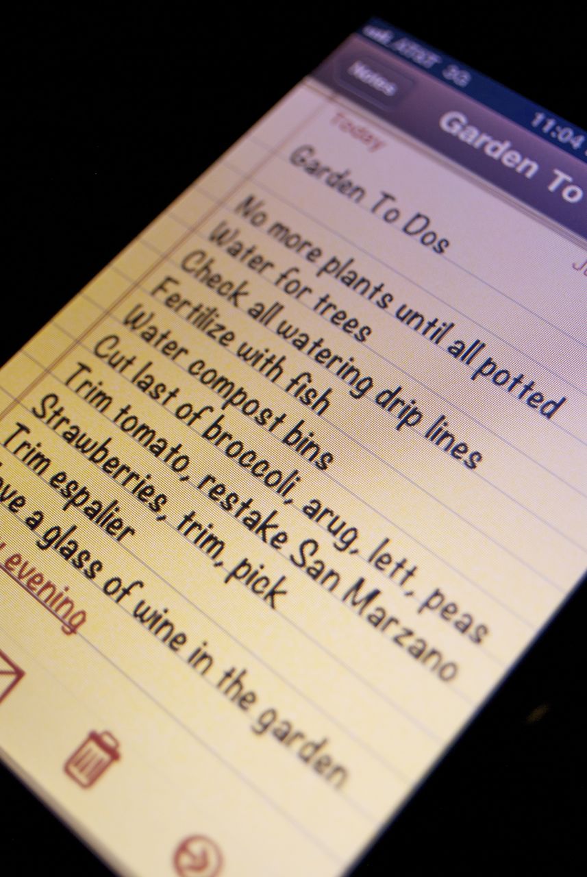 Yes, I know it’s pretty geeky to put your garden “To Do” list on your phone but if you could only see my handwriting (southpaw, taught to write several different ways during elementary years) you would know why I have converted to using my phone for even simple things such as lists. Plus, I don’t have to keep track of small pieces of paper….I know, I’m digressing. Anyway, here’s a more legible version…