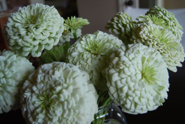 I am also very excited that my Tequila Sunrise orange peppers have ripened completely (peppers have a hard time getting started in my garden so sometimes they don’t reach their full color) and my ‘Polar Bear’ zinnias from Rene’s looked so beautiful that I just had to bring some inside to enjoy.