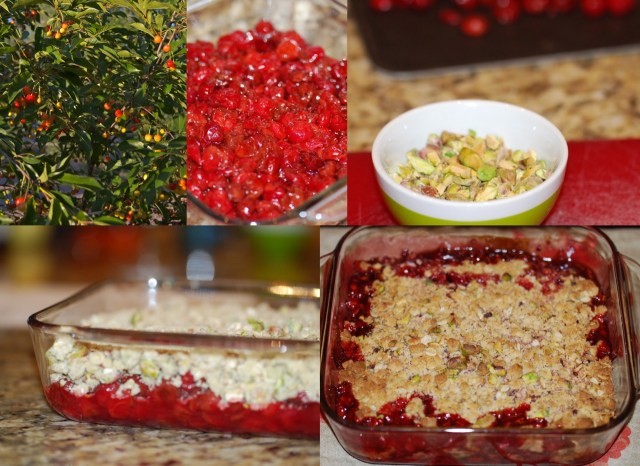And my third choice for the week was a sour-cherry pistachio crisp. Again, while searching the freezer I found several containers of wonderful sour-cherries that I picked from my mom and grandma’s trees. I looked for some recipes with a healthy bent and came up with this one from Martha Stewart. I was intrigued with combining these intricately flavored cherries with pistachios, a favorite nut around our house. Interested?