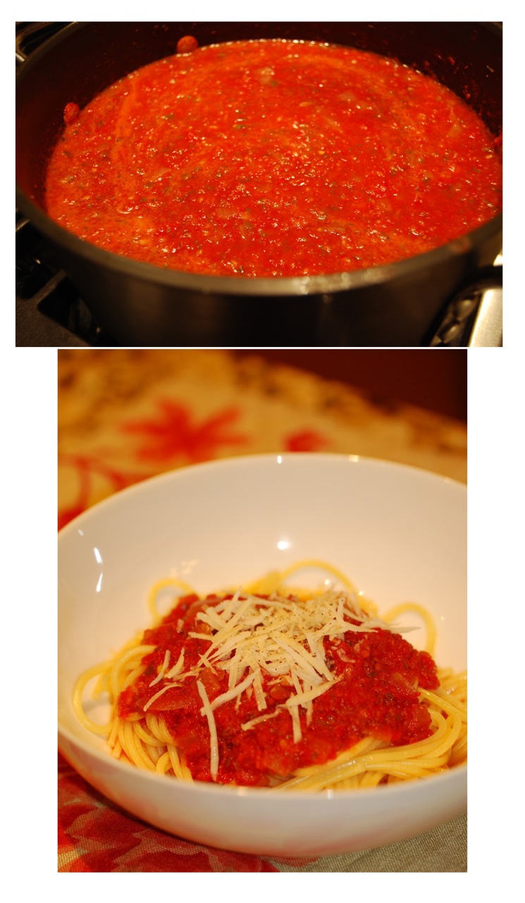 Through the process of looking around in the freezer I found some packages of my homemade spaghetti sauce. You may be thinking, “o.k., some tomatoes from the garden”…but there are onions, carrots and lots of herbs in it as well. So really, lots of fresh produce straight from the garden, with a stop in the freezer, to the table.