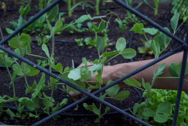 Inspired, I planted my peas (‘Oregon Sugar Snap’ and ‘Golden India’) very close together with the idea that I would harvest some of the shoots as a way of thinning the plants.