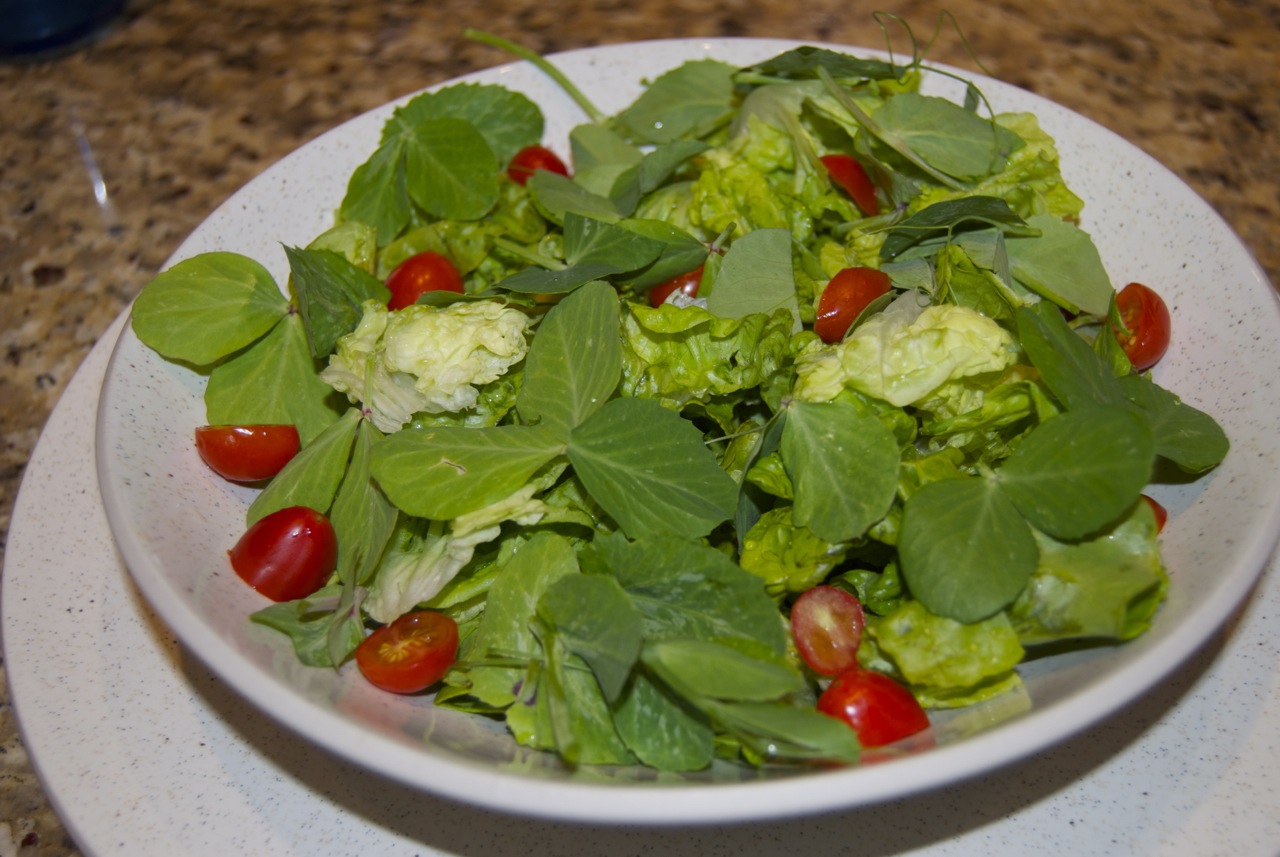 We had homegrown salad leaves and herbs from the garden tonight! 😀 I don’t have enough peas to eat the shoots, as I only have containers, but I do have baby spinach and chard!