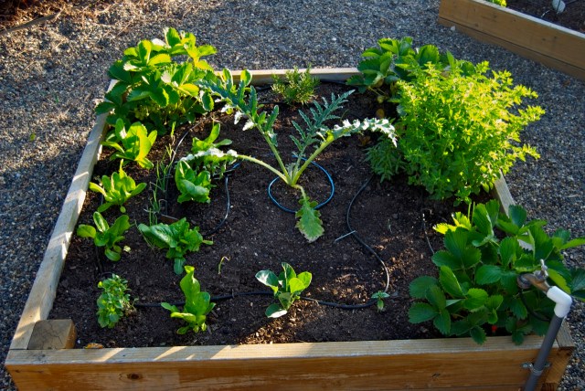 This is the smallest bed and it contains strawberries, onions, lettuce, herbs and an artichoke. I’ve  harvested a few strawberries so far and cut some lettuce and rosemary.  Oh, I also have a cauliflower planted and this is my first try growing this veggie.