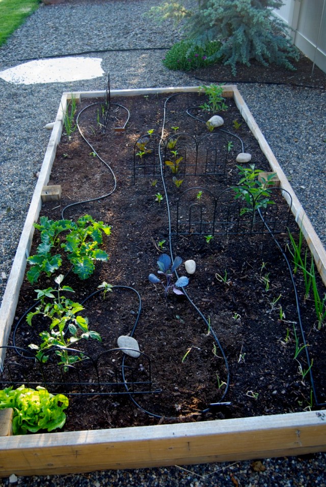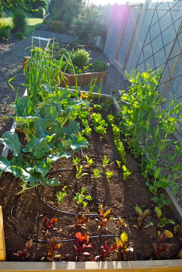 Here is a photo showing the entire alley and the closest bed is the first one I planted this Spring.  It holds beets, arrugula, kale, lettuces, peas, carrots,  garlic, onions, broccoli, a cabbage and calendula flowers.  I’ve been harvesting lettuce, arugula and beet foliage for a few weeks.