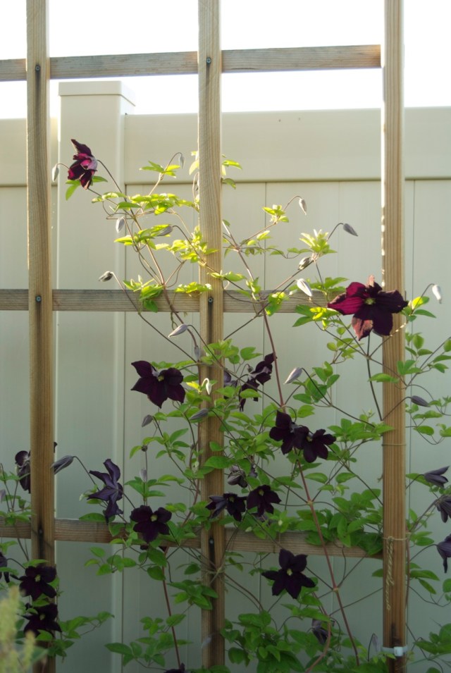 My last favorite to show is a new clematis, ‘Romantika’ that is blooming on the trellis the ‘wonder builder’, a.k.a. my husband, built last fall.  The blooms are very dark plum reminding me of a yummy Port wine somehow.  Maybe this is a sign I should plant some grapes!