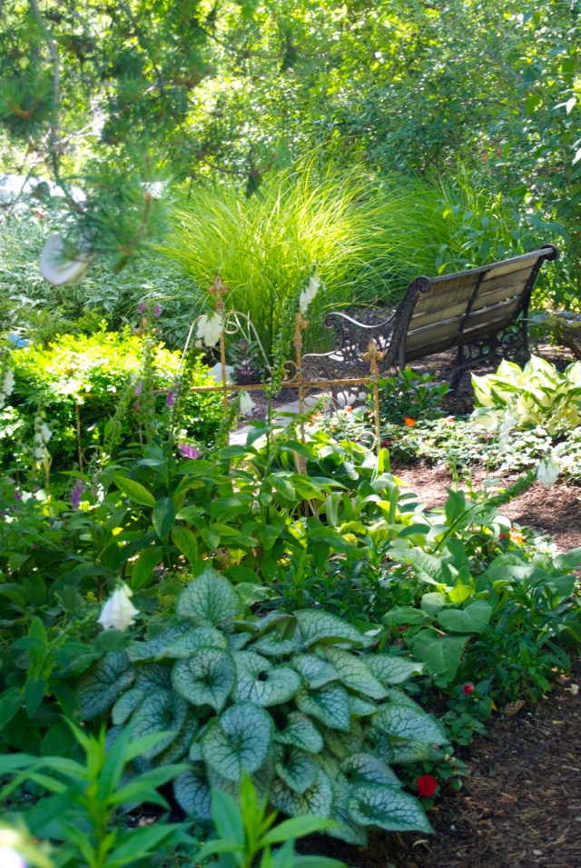 Garden 6 –  Charm Like No Other.   So much to see in this most comfortable, welcoming, whimsical garden that starts out with a shady courtyard area and pretty shade plant plantings.  On the other side of the courtyard is a short path that takes you to a hillside garden offering a lovely seating area and plants that handle mixed shade and sun.  There is much to see in this sweet spot and I love the bright splashes of color from Impatiens and others that are tucked into the understory of this area.  As you continue to follow the path towards an iron arbor there is a bit (just the right amount in my opinion) of garden whimsy here and there.