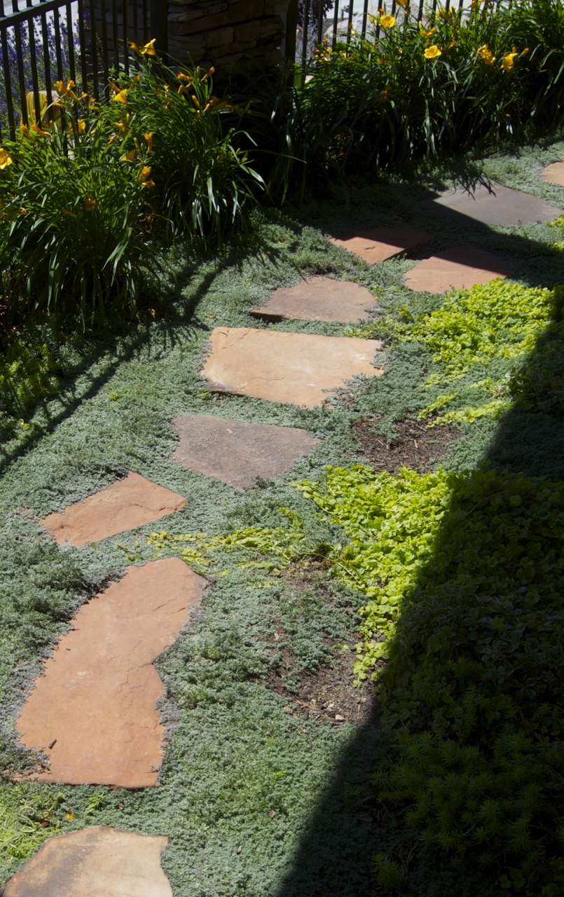A fun steppables/stone path takes you  to the first hidden spot for taking a break from the sun.  A little french “room” – perfect for sitting a bit to think about what you might plant next!