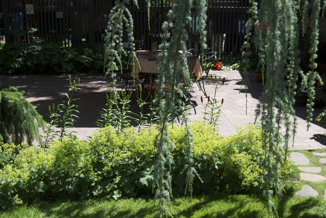 I only left the sweet smelling lavender area because of the inviting patio ahead.  The patio area was cozy, yet open with a variety of structures surrounding it.  One of the standout structures was a weeping cedar or spruce that served as an entry point on one side.  I noticed it immediately and found out from the gardenkeeper that they had trained and supported the tree in such a way that it could indeed serve as an “arbor” to the patio.  So creative!  I also liked that the patio featured a single color as a draw for the eye.  A summer red was splashed about and it was beautiful.