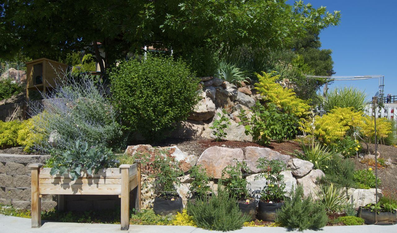 Garden 7 – Sol-Full Garden.  I chose this title as this sun-drenched, Mediterranean style garden speaks to the soul with it’s beautiful colors, tropical accents and hidden spots for resting, reflection and rejuvenation.  Oh, and did I mention is has edible plantings as well!
