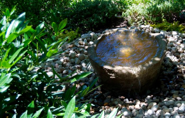 A path from the pond winds through the property to the front yard which is grass-free and shows off a subtle water feature, a lovely sitting area and interesting perennial plantings.