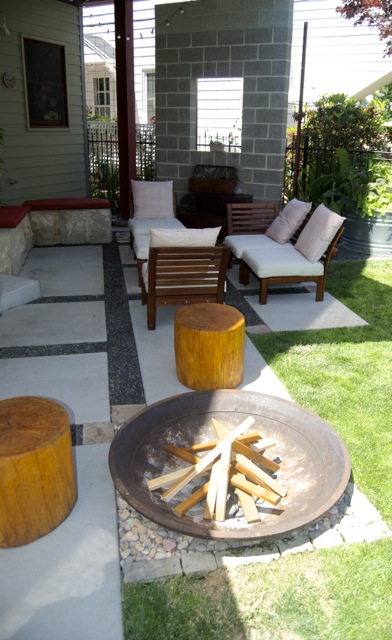 Walking into the back garden  you see an inviting patio area, a quiet water feature and a simple fire pit for two.  I found the design easy on the eyes and I love the combination of urban and natural worlds with the use of rock, cement, iron and wood.