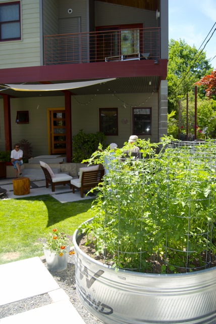 In keeping with current trends, this outdoor space is not only a place to relax, it is productive and bountiful.  Look at this awesome raised veggie plot!  These gardeners know how to get an early start on the edible season.  I’m sure this soil begins to warm quickly in the spring.